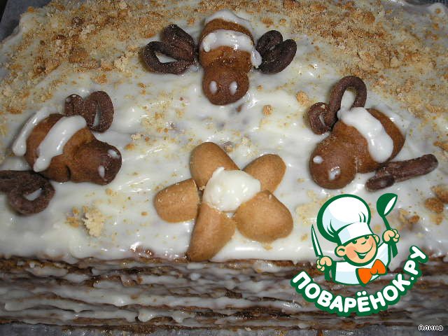 Тортик с чуть заметным вкусом меда и нежным заварным кремом для любителей медовых фантазий. Этот рецепт из книжки «100 тортов» 1990 г., а пчелки родились во время приготовления.