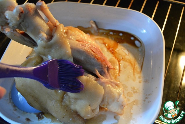 Перекладываем в форму или на противень и готовимся активно провести ближайшие 45 минут - надо просто периодически доставать и смазывать нашу красавицу пивом, чтобы появилась красивая глазурь и ароматная, хрустящая корочка! Я делаю это с интервалом 5-7 минут, каждый раз хорошенько смазывая рульку. Духовка при этом стоит на 200 градусах.