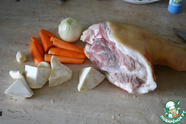 Рульку хорошенько промываем, счищаем щетину (если она есть). Чистим овощи: морковь, лук, чеснок, сельдерей. Все отправляем в кастрюлю с водой - после закипания снимаем пенку, добавляем лавровый лист, специи, соль. Накрыть крышкой, убавить огонь до слабого и варить 2,5 часа.