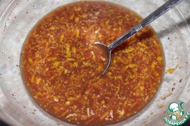 Для маринада: цедру апельсина натереть на мелкой терке, выжать из него сок. Корень имбиря очистить и натереть на мелкой терке. В миске смешать сок и цедру апельсина, имбирь, соевый соус, белое вино, мед, корицу, перец-чили, семена аниса. Перемешать маринад, чтобы мед растворился.