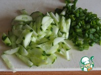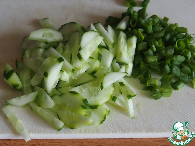 Нарезать свежий огурец и зеленый лук. Фунчозу приготовить по инструкци на пачке. Готовую фунчозу я всегда режу, чтобы лапшинки были покороче. |