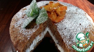 Пирог я украсила цукатами из апельсинового варенья, веточкой мяты и присыпала сахарной пудрой.