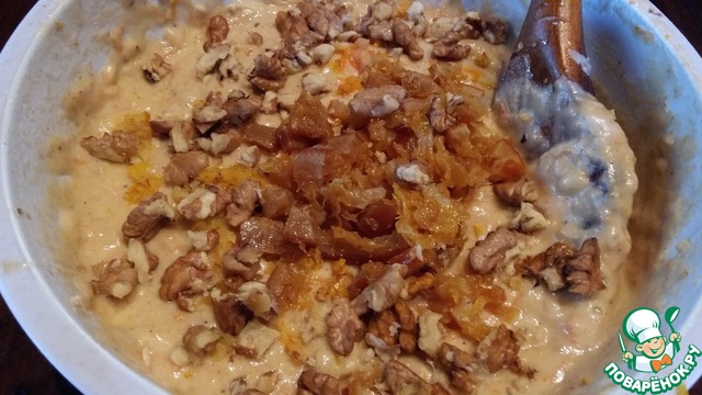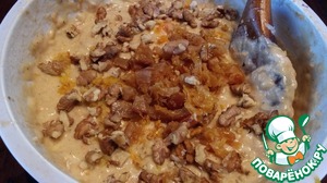 Аккуратно перемешать все с просеянной с содой и разрыхлителем мукой, добавить пряности и грецкие орехи.
