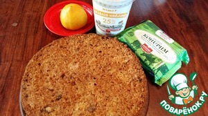 Корж разрезать на 2 половины. Для крема рикотту взбить с 2 ст. л. сметаны и сахарной пудрой /по вкусу/, добавить тертую лимонную цедру. 10 гр. желатина замочить в 50 мл. холодной воды на 30 мин., или до его полного набухания. Затем нагреть желатин до полного растворения, не доводя до кипения.