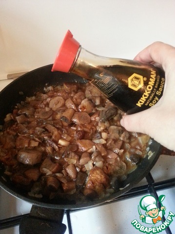 Затем добавляем грибы и соевый соус. Накрываем крышкой и тушим 20 минут.