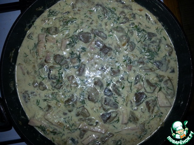 Теперь приступаем к заправке грибного соуса. Берем муку и обжариваем ее на сухой сковороде, буквально несколько минут. Мука не должна потемнеть, а должна стать легка кремового цвета. Затем добавляем в нее сливки и тщательное размешиваем. Как только масса стала однородной добавляем ее в грибы вместе с ветчиной, укропом, накрываем крышкой и тушим еще 10 минут.