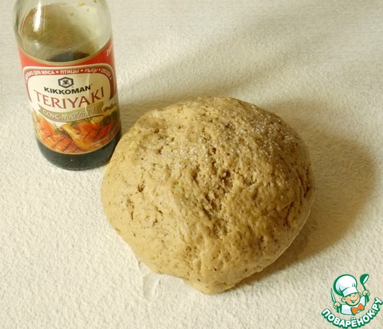 Теперь сам процесс. Картофель почистить, сварить без соли, слить воду и превратить в пюре. Отвесить нужное количество, добавить соевый соус-маринад "Teriyaki" от фирмы "Kikkoman", растопленное масло, грибной порошок, белок, муку, разрыхлитель и замесить тесто. Оно получается очень мягким податливым в руках. Если липнет, то добавьте еще немного муки.