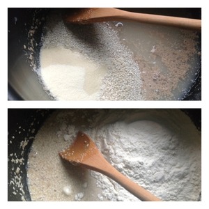 Сыворотку подогреть. Всыпать соль, сахар, дрожжи. Перемешать.