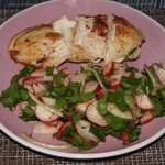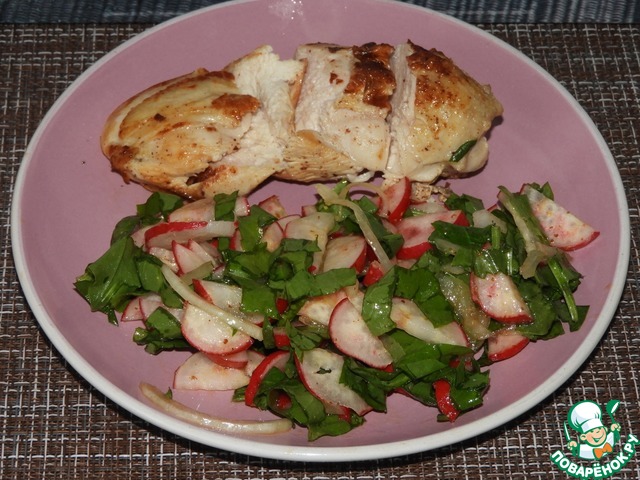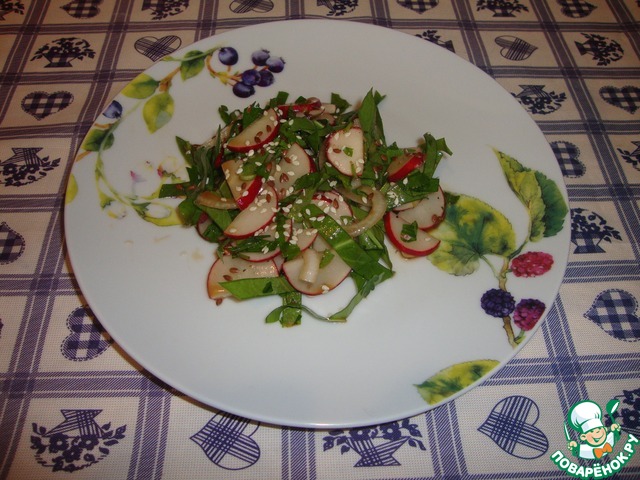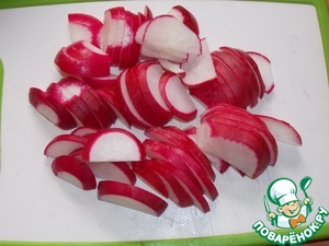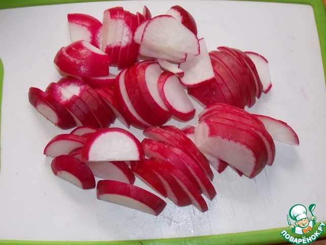 Добавить уксус, мёд и горчицу- перемешать. Редис смешать с зеленью,
