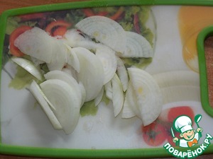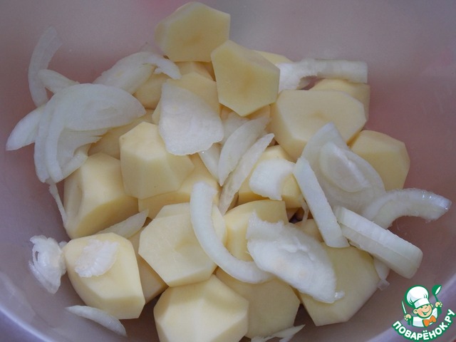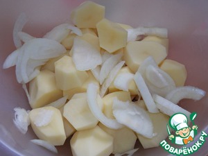 Картофель порезать порционными кусочками, сложить в миску, добавить лук.