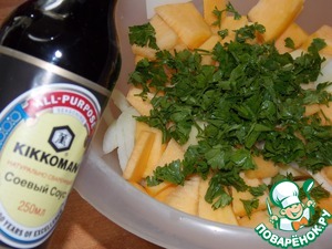Влить соевый соус и растительное масло. Добавить специи, соль и перец.
