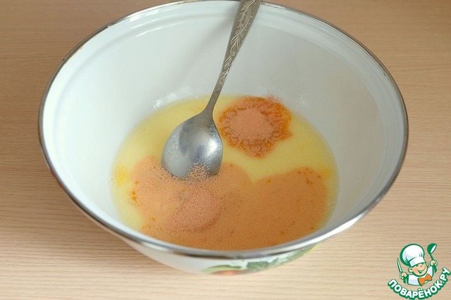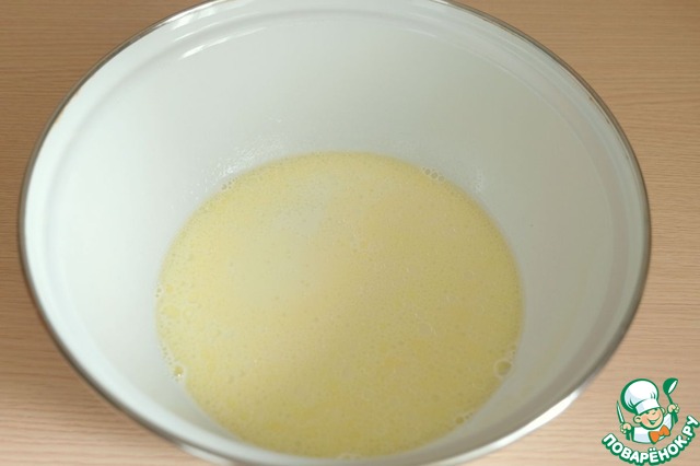 В миску добавить 1 стакан теплого молока, добавить 50 гр. растопленного сливочного масла, 1 ст. ложку растительного масла, 2 ст. ложки сахара.