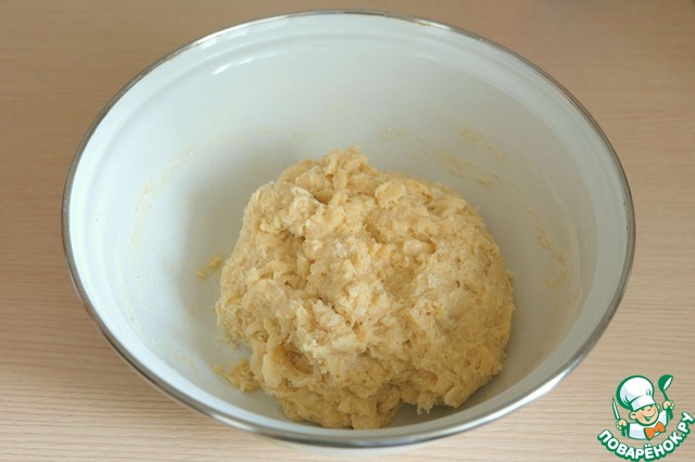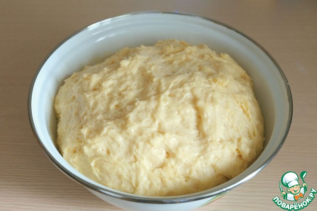 Замесить тесто. Емкость с тестом накрыть полотенцем и поставить в теплое место для подъема. Как только тесто поднимется, а это произойдет примерно через 1 час., его нужно хорошо обмять и поставить для вторичного подъема. Пока тесто поднимается приступим к приготовлению начинки.