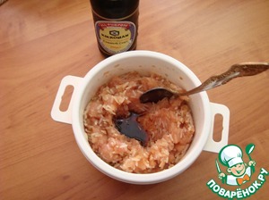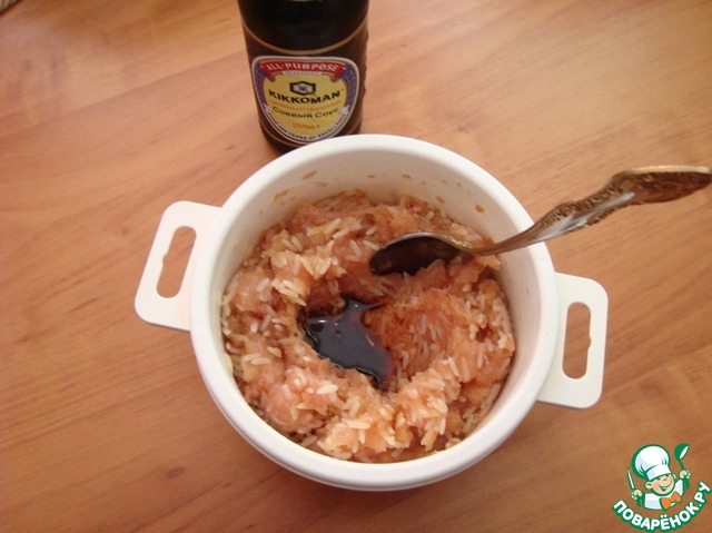 Из грудки делаем фарш или берём готовый. Добавляем рис, яйцо и соевый соус. Перемешиваем.