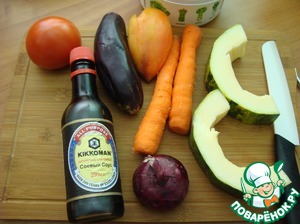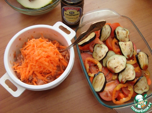 В фарш натираем морковь. С морковью фарш будет сочный. Овощи режем произвольно. Форму смазываем 1 ст л масла и на низ укладываем половину порезанных овощей. Поливаем соевым соусом.
