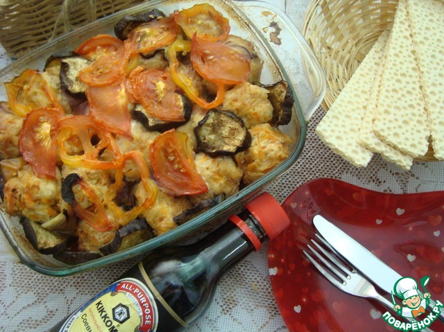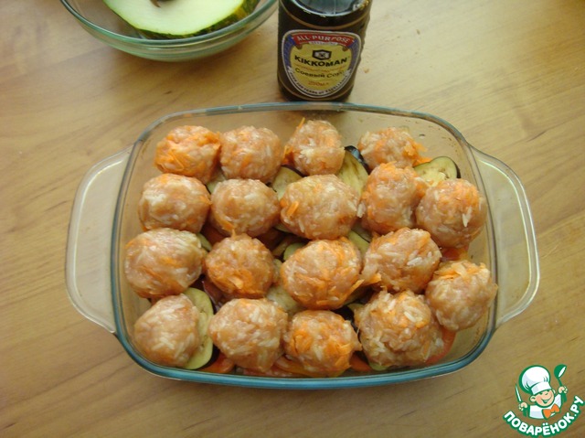 Куриные тефтели с рисом и морковью, с соевым соусом, запечённые с овощами тоже в соевом соусе. Диетическое блюдо. Без специй и соли-только соевый соус. В тефтели добавила натёртую морковь, что сделало их сочными.