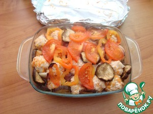 Поверх выкладываем оставшиеся овощи. Заполняем все свободные места в форме и поливаем сверху маслом.