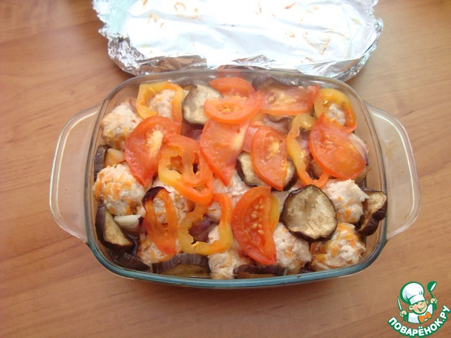 Формируем тефтельки и выкладываем на овощи. У меня из этого фарша получилось 18 шт тефтелей, величиной с грецкий орех.