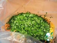 Мелко нарезать большой пучок петрушки. Добавить петрушку к овощам.