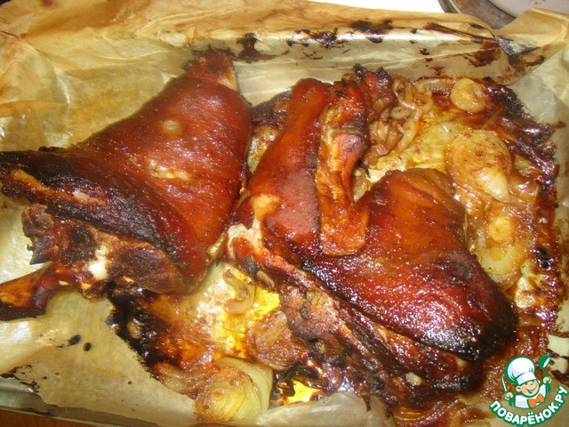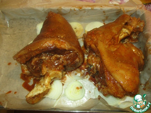 А пока возьмем противень, выстелим его пергаментной бумагой и выложим на дно лук оставшийся, порезанный кольцами (чтобы не подгорела рулька). Рульки смазываем хорошенько нашим приготовленным соусом и выкладываем на лук и отправляем в разогретую духовку на 40-45 минут.