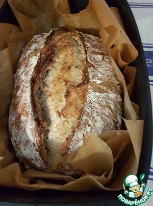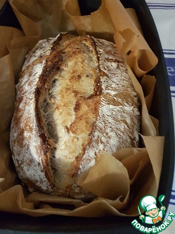 Тесто конвертным швом вниз выкладываем в утятницу или жаропрочную кастрюлю с крышкой, которую предварительно выстилаем пекарской бумагой. Делаем неглубокий надрез посередине и отправляем нашего красавца в духовой шкаф.