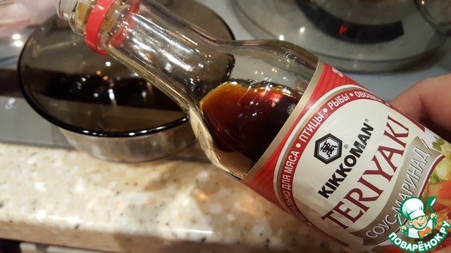 • Смешать в подходящей ёмкости соус-маринад Терияки от ТМ Киккоман, мёд, соус из жёлтых слив и кунжутное масло. Хорошо смешать вилкой маринад.