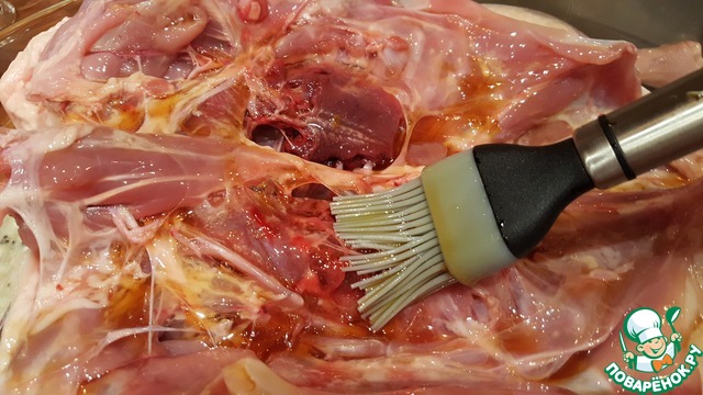 • Перевернуть утку спинкой вверх. Можно одеть фольгу на тонкую часть крыла. Смазать утку маринадом. Оставить на часок.