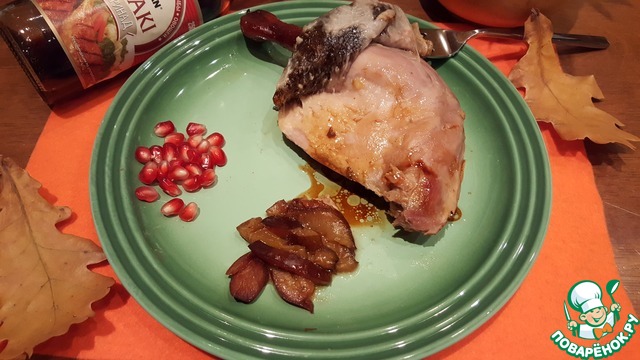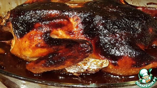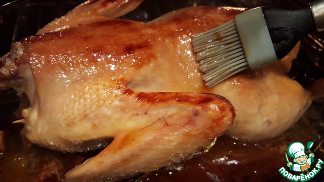 • Разогреть духовку до 200°. Поставить форму с уткой в духовку запекаться примерно на 80 минут. Несколько раз за время запекания смазать утку маринадом.