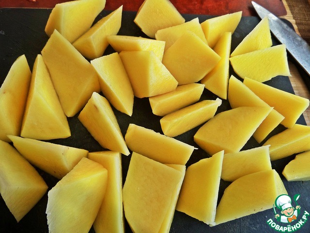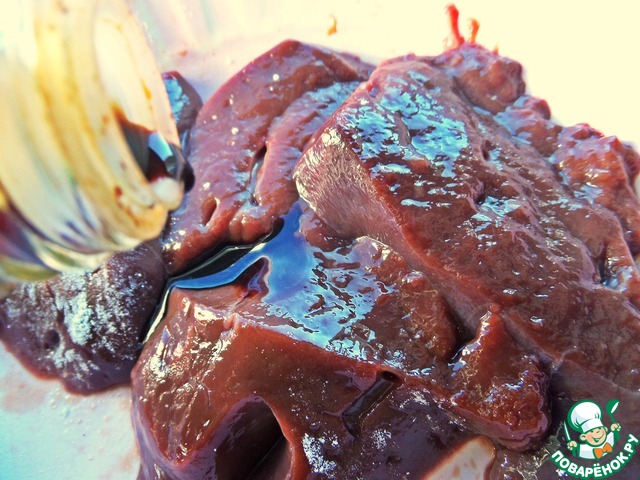 Печёнку промыть, обсушить, избавить от жил и плёнок. Нарезать на ломти шириной в 1-1,5 см.