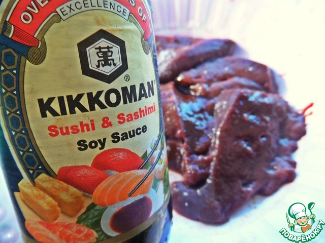 Залить соевым соусом "Киккоман" и перемешать в нём.