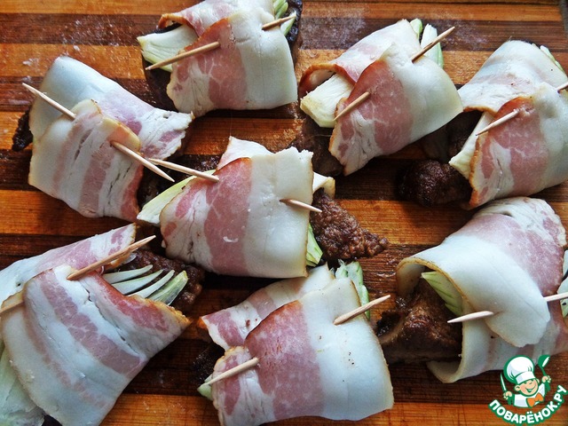 Накрыть беконом внахлёст и зафиксировать зубочисткой.