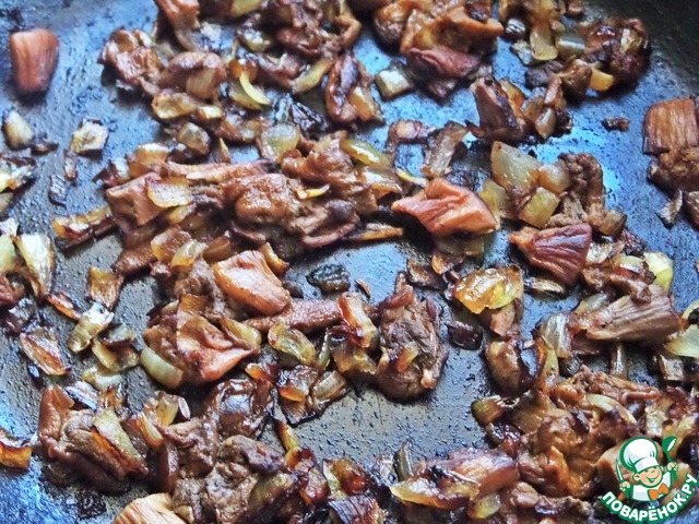 Обжарила его и добавила вслед нарезанные лесные грибы (были заморожены уже обжаренные с лета). Посолить.