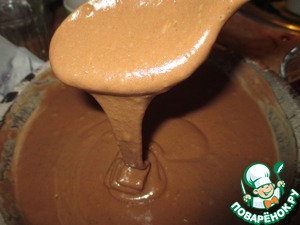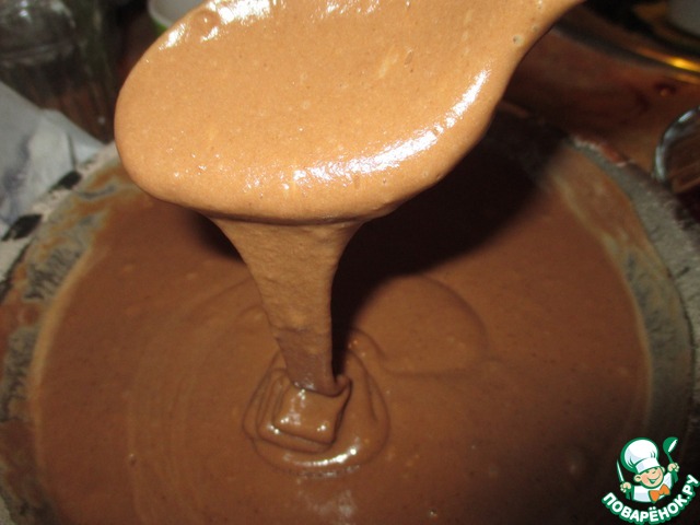 В сухие ингредиенты для теста влить аккуратно воду с маслом. Размешивать, что бы комочков было как можно меньше.