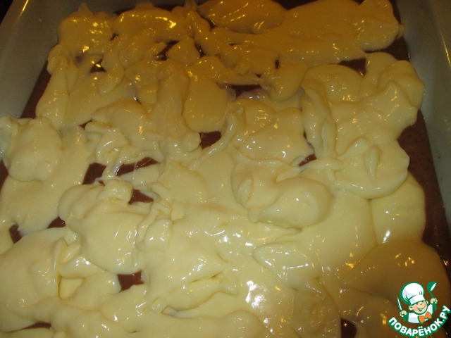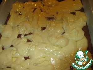 В смазанную форму вылить чуть меньше половины теста. Сверху аккуратно выложить столовой ложкой не совсем остывший пудинг. Надо постараться, покрыть всё тесто, ну во всяком случае хотя бы, что бы зазоры были поменьше.