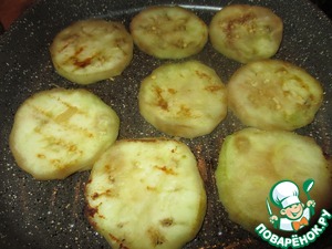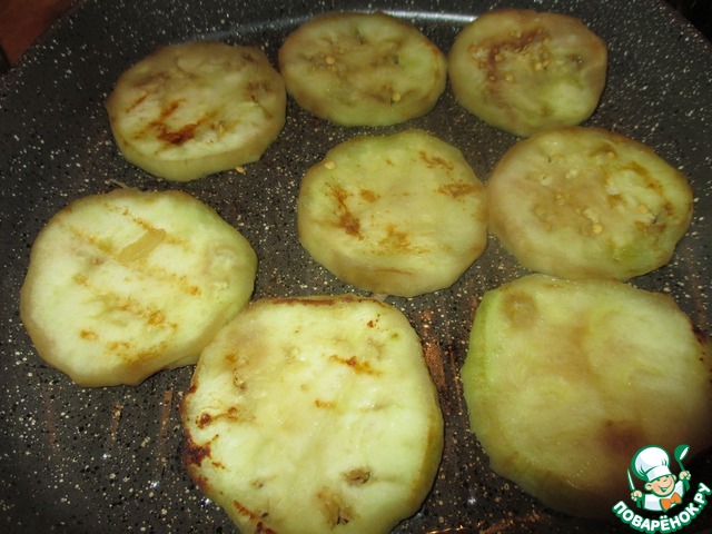 Баклажаны помыть, очистить от кожуры, нарезать кружочками, толщиной примерно по 0,5 см, посолить хорошенько, помять руками. Отставить в сторону минут на 20. Потом их промыть, слегка отжать и обжарить с двух сторон на небольшом количестве масла, до полуготовности.