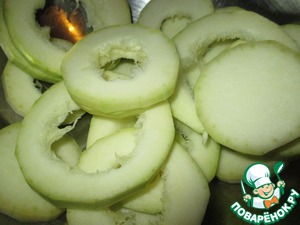 Кабачок помыть, почистить, нарезать кружочками, толщиной так же примерно 0,5 см. Если кабачок не молодой, то удалить семечки и мякоть. Это даже удобнее получится.