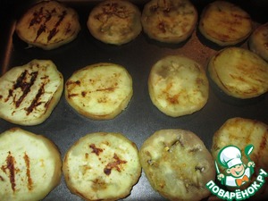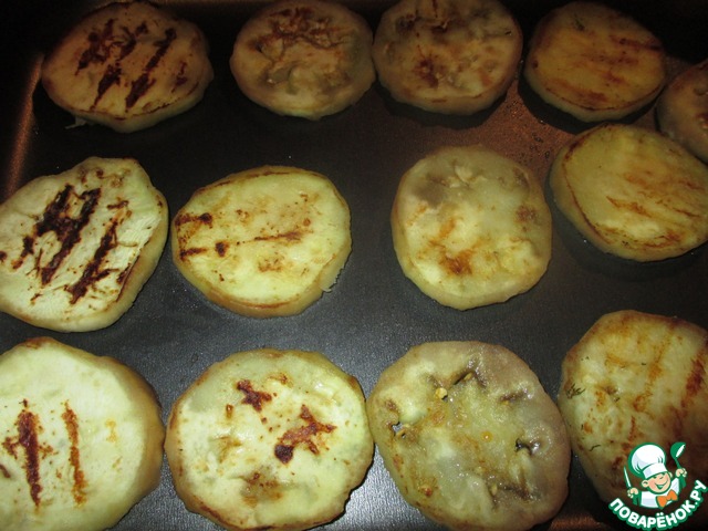 Взять огнеупорную форму, выложить кружочки обжаренного баклажана. Присолить чуть-чуть.
