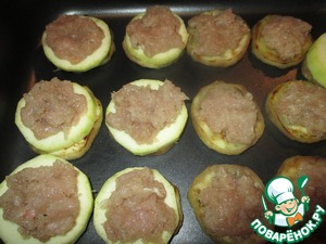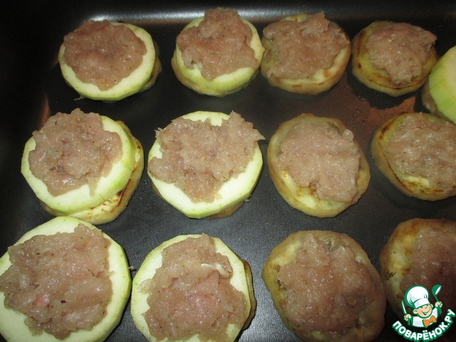 Отщипывать от фарша небольшие кусочки и выкладывать на кабачки. -