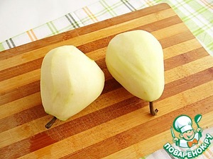 Получаются ароматные груши. Образовавшийся сок выливаю из половинок груш в сотейник. Груши выкладываю на блюдо, даю им чуть остыть.