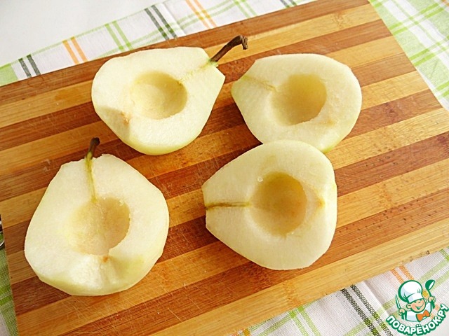Разрезаю груши пополам, с помощью ложки нуазетки удаляю сначала семена, затем еще немного мякоти, чтобы углубление стало чуть больше.