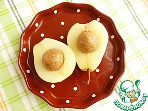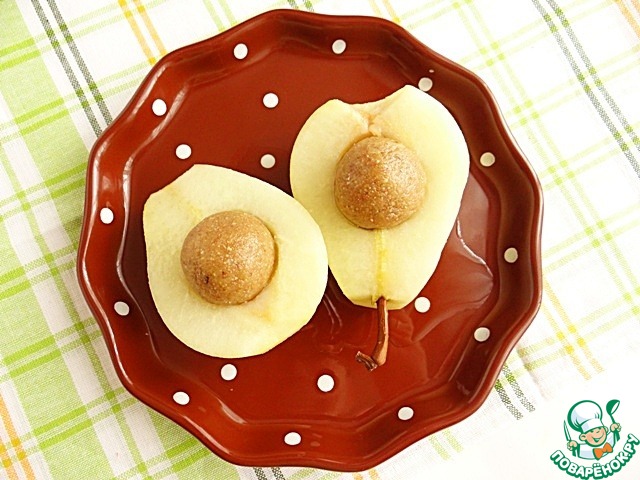 Ореховую начинку перемешиваю, формую шарики и выкладываю их в углубление половинок груш.