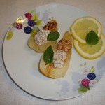 Украшаю десерт половинкой грецкого ореха и листиком свежей мяты. Поливаю груши образовавшимся в сотейнике соусом. Приятного Вам аппетита!