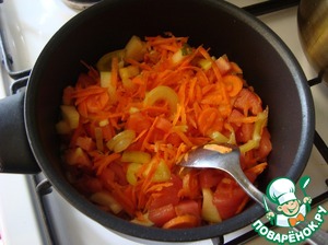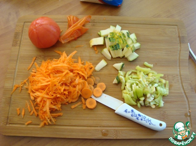 Овощи режем произвольно. Морковь я половину натёрла, а половину порезала. С помидора снимаем кожицу, предварительно надсекаем крест-на-крест и ошпариваем.