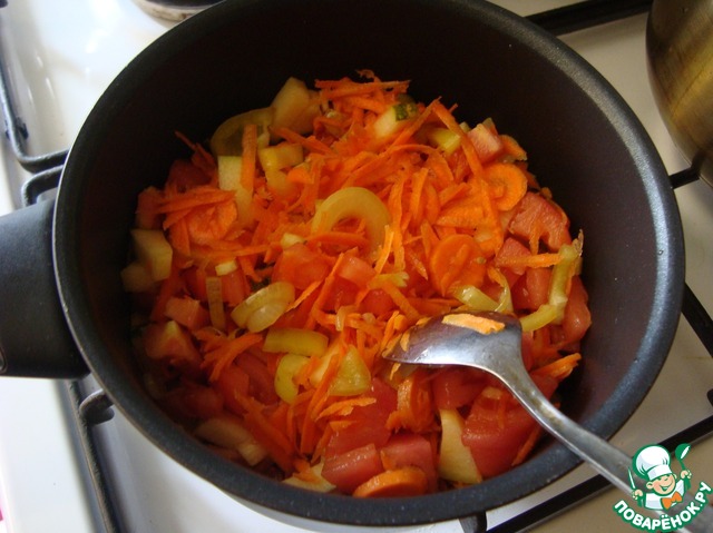 Берём сотейник или сковороду, наливаем масло, разогреваем и выкладываем лук, порезанный полукольцами. Золотим его. Выкладываем овощи и тушим минут 15.