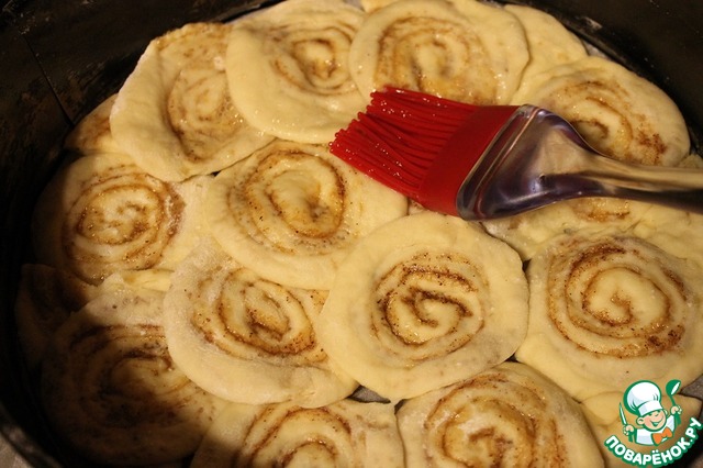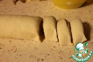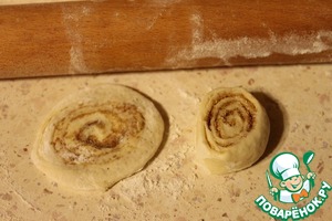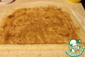 Тесто разделить на две части, одну часть раскатать в пласт, толщиной 3-4 мм, распределить по тесту половину корицы с сахаром.