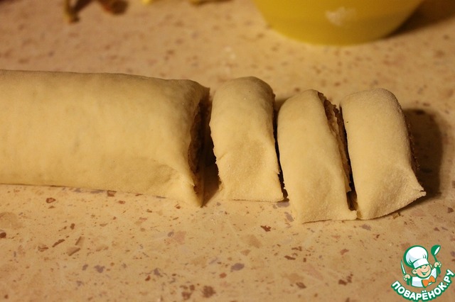 Рулет нарезать на кусочки толщиной 2-3 см.