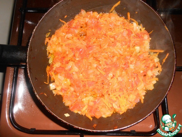 Лук и морковь пассеровать на растительном масле, добавить помидоры, тушить 2-3 минуты. В это время пшено залить водой или бульоном и поставить на огонь. (Воды берется в соотношении 1:3, но если любите более сухую, рассыпчатую кашу, то воды нужно немного меньше 1:2,5 (пшено:вода)).