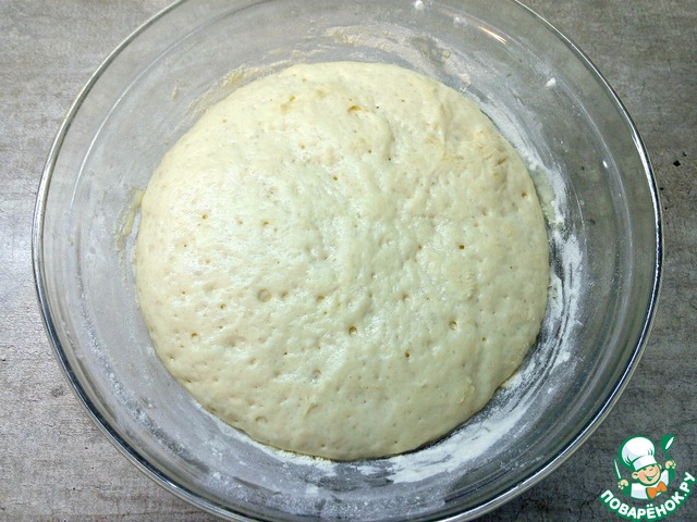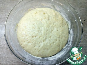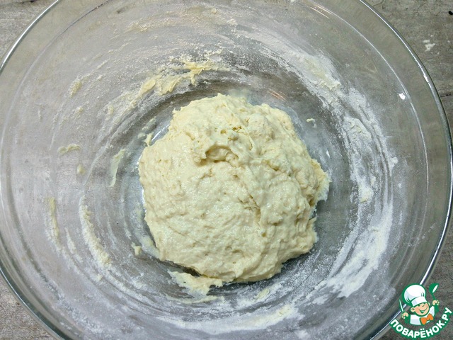 Затем к дрожжам добавляем масло, просеянную муку и замешиваем мягкое тесто. Оставляем его на час в теплом месте для подъема.