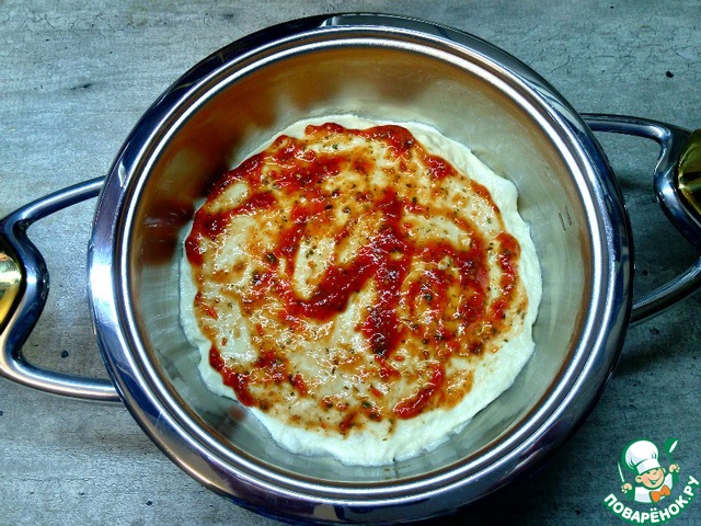 Пока тесто подходит приготовим томатный соус. У меня был уже готовый домашний томат, просто проваренные и пропущенные через мясорубку томаты, без соли, сахара и специй. Вы можете использовать свежий помидор, пробив его блендером до пюреобразного состояния.