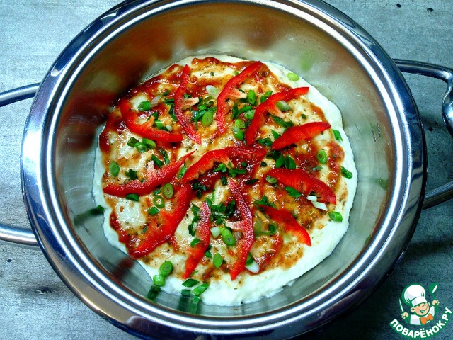 Сверху посыпаем мелко нарезанным зеленым луком и выкладываем нарезанный болгарский перец.